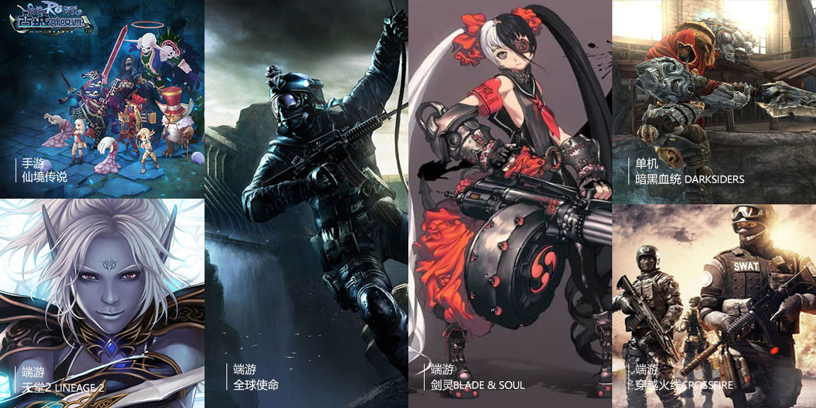 《穿越火線》、《天堂2》、《地獄之門》、《暗黑血統(tǒng)》、《全球使命》、《戰(zhàn)爭(zhēng)機(jī)器資料篇》、《劍靈》等項(xiàng)目。